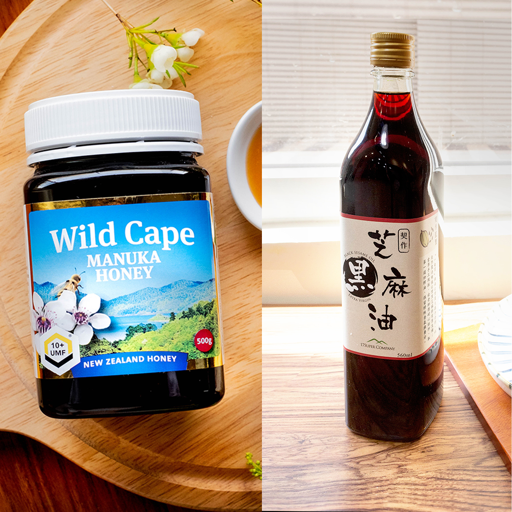 {契作芝麻油}使用台灣原生種黑芝麻,採低溫烘焙的百分之百初榨油,沒有熱壓產生的苦燥,保留完整的營養和濃郁的香氣,富含鐵質、鈣、磷、維生素B1、B2、A、D、E,以及85 %不飽和脂肪酸,能滋補暖身,對抗風寒。紐西蘭國寶{野生麥蘆卡蜂蜜 UMF10+},有國家認證的天然抗菌係數UMF10+ 及活性麥蘆卡因子,能改變菌叢生態,維持消化機能,給全家人更多的保護力,不怕病菌的騷擾。