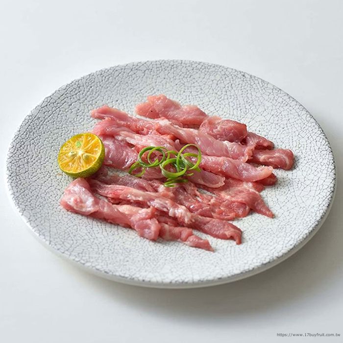 位於後腳蹄膀的上方,肉質細嫩柔軟、脂肪含量少肉質鮮嫩,富有嚼勁的後腿肉製成的低脂肉絲。運用在煎、炒料理皆可。