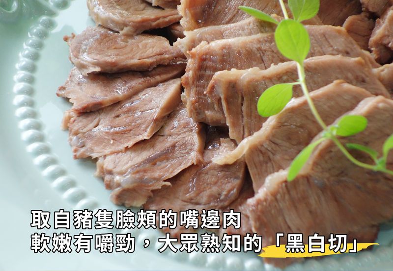 取自豬隻臉頰的嘴邊肉嘴邊肉位於豬臉頰兩側,咀嚼時會運動到此部位,肉質軟嫩卻有嚼勁,很適合燉滷等方式, 也有人將稱之「菊花肉」。很常出現在「黑白切」這道經典料理中。